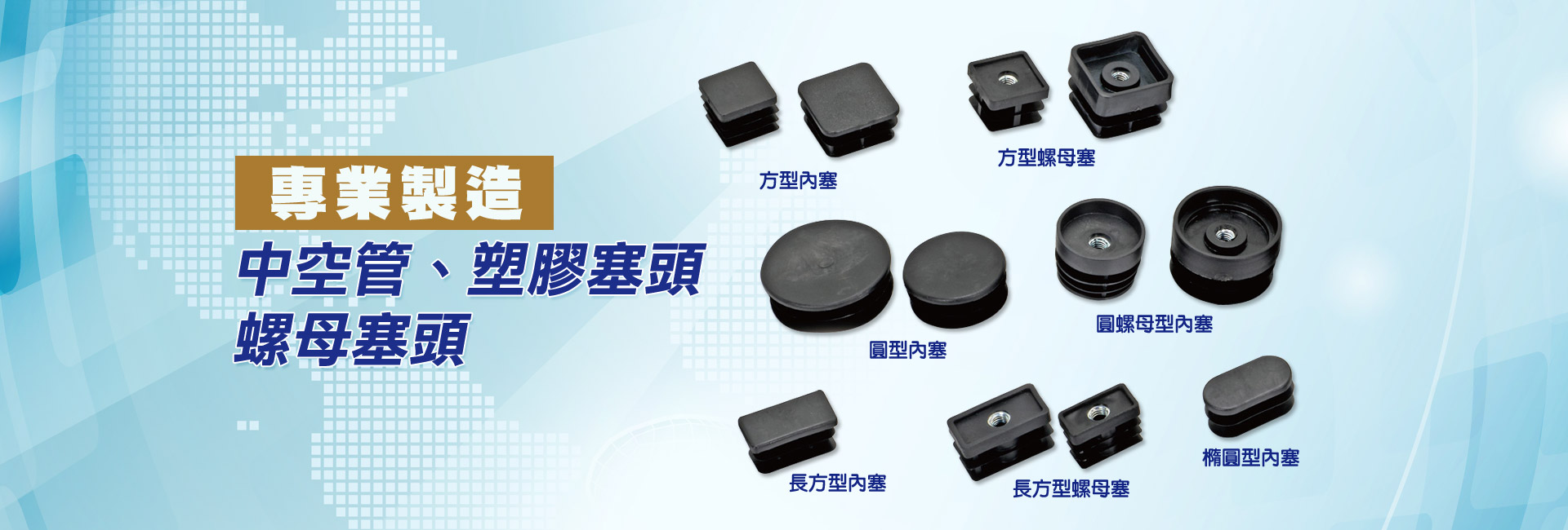 旋钮, 管塞, 螺母塞头, 塑胶塞头, 铁管塞头, 钢管塞头, 脚垫,  组合脚垫, 调整脚垫, 止滑脚垫, 固定脚垫, 垫片, 转轮…等塑胶射出成型制品。
